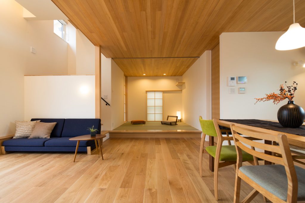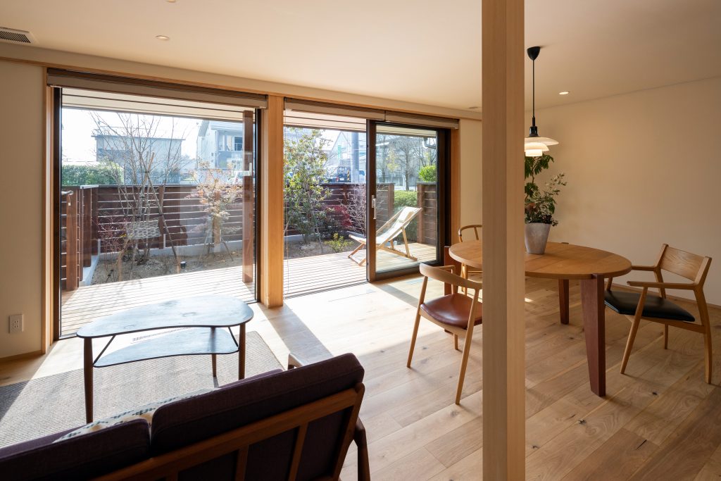 こちらのお宅では、リビングの床と同じ高さで外のデッキを配置、大きなFIX窓でサッシ枠の存在感を減らして天井と床の連続性を強調しています。連続性を重視することでリビングの広さが実際の面積よりも広く見え、広がりのある空間を作り出しています。