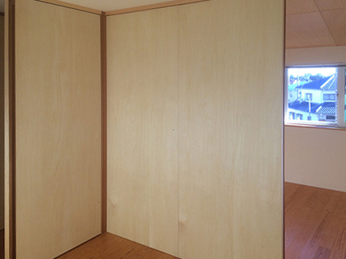 大工さんが作った壁を採寸して建具屋さんが引き戸を作ります。少し日にちをいただいて建具を取り付けて・・・無事に完成です!建具で作った壁は簡単に取り外せるので今後の生活の変化にも容易に対応できます。