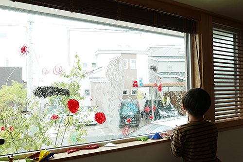 南側に大きな腰高の窓が設置されているお宅なのですが、その窓から植栽がみえます。見える葉に果物や虫を重ねて描くことで絵画が完成。子供の発想は本当に豊か。新築すると傷に対してナーバスになりがちですが、新生活を楽しむことを忘れないでください。なお、こちらのクレヨンは水ぶきで消すことができるクレヨンだそうですよ。